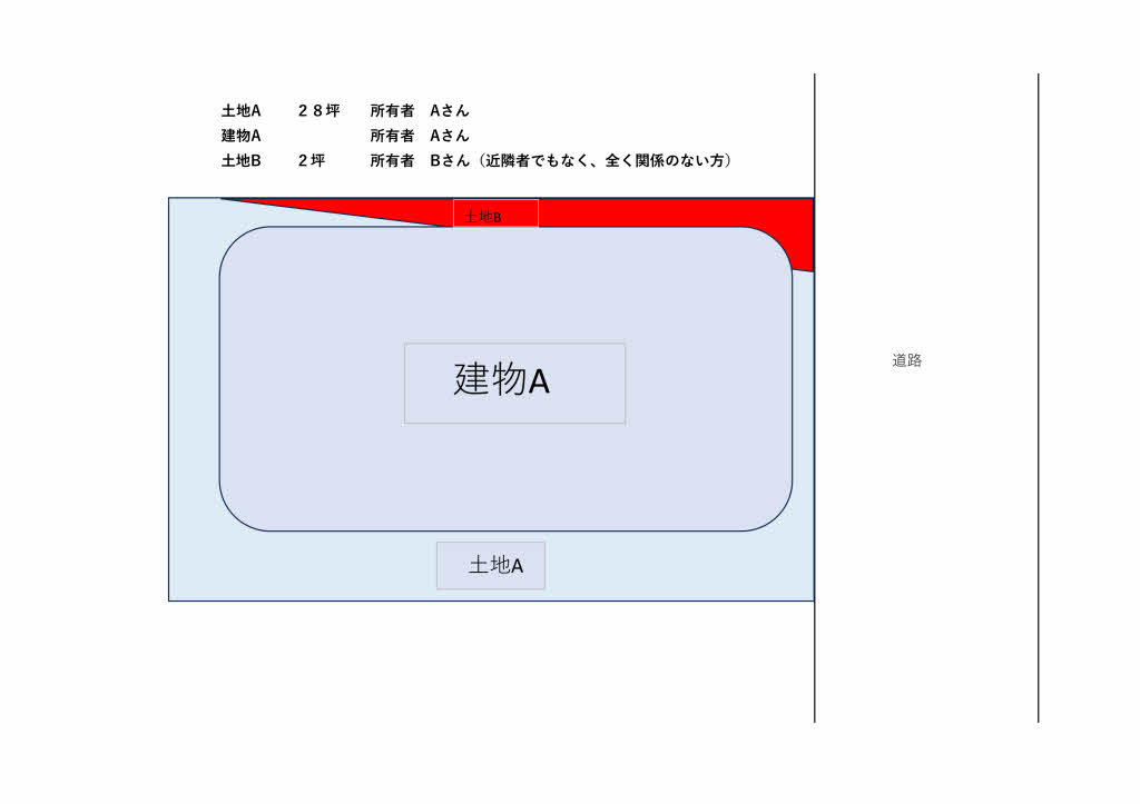 しかし、調べてみると建物は、土地は28坪以外に2坪の2筆に分かれていて、それぞれ所有者が違っていて、建物は土地Bに完全に越境して建てられていることが分かった。